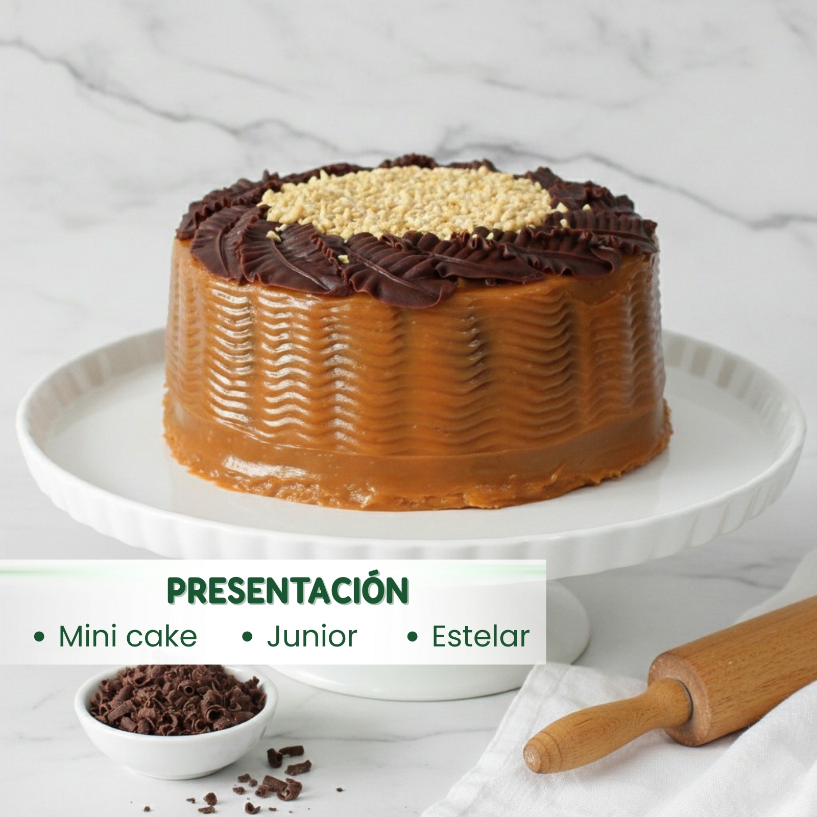 Torta de chocolate recubierta con arequipe y maní, hacen de esta una combinación exquisita para toda ocasión.